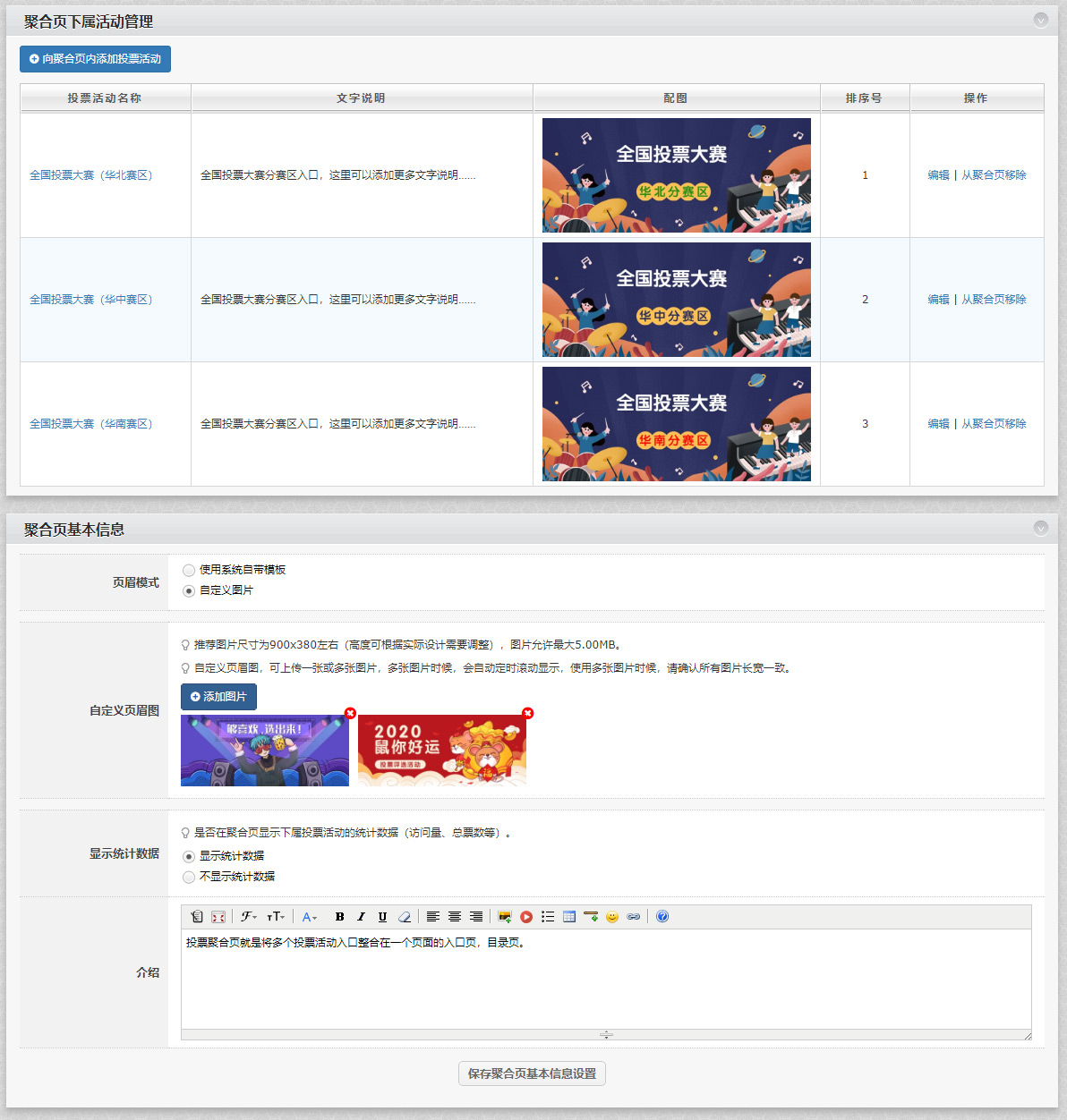 如果您创建了多个相关的投票活动,需要整合起来,可以通过“聚合页”功能制作一个统一入口页,将多个投票活动的入口整合在一个页面。 聚合页具有唯一网址和二维码,方便宣传和用户进入。 按此可查看聚合页演示。