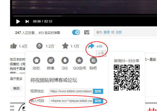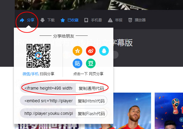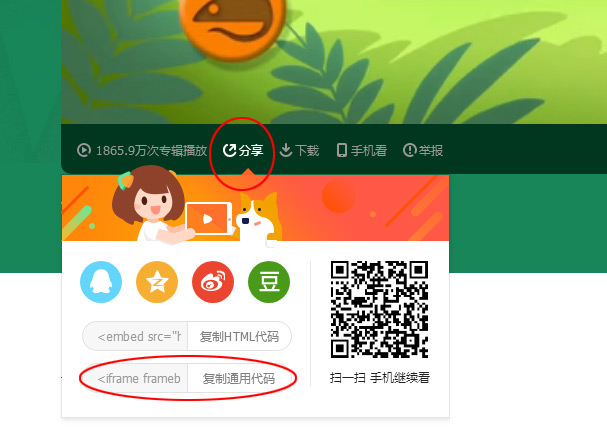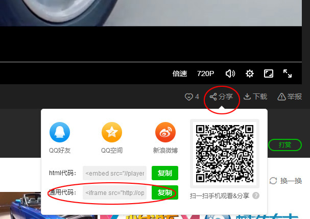各家视频网站获取通用代码的界面略有区别,但都大同小异,请参考以下截图。