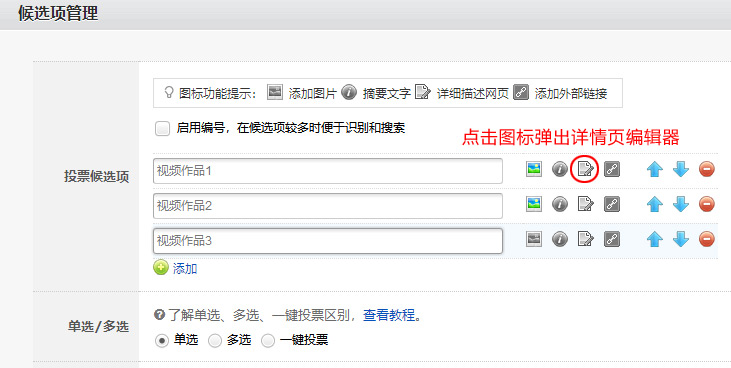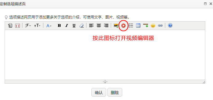投票吧不直接提供视频存储服务,您必须先将视频上传到优酷、腾讯、爱奇艺等第三方视频平台。随后在各个候选项的详情描述页通过后台自带的编辑器插入(引用)相关视频。具体流程如下: