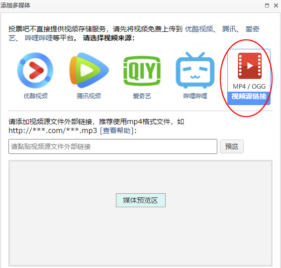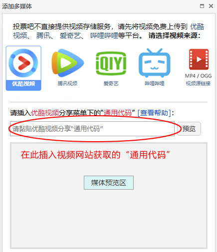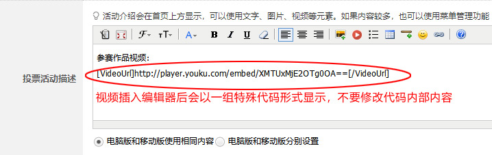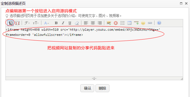 以上制作视频投票的方法对优酷、腾讯、爱奇艺都能较好支持,如您需要引用其他视频网站的资源,请直接通过编辑器的“源码模式”(目前只有白金版支持),插入相关的视频站点提供的代码,如下图。