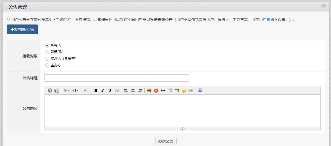3、后台管理提供了群发公告功能,如果划分了用户身份类型,则可以针对不同身份用户推送不同的公告信息。