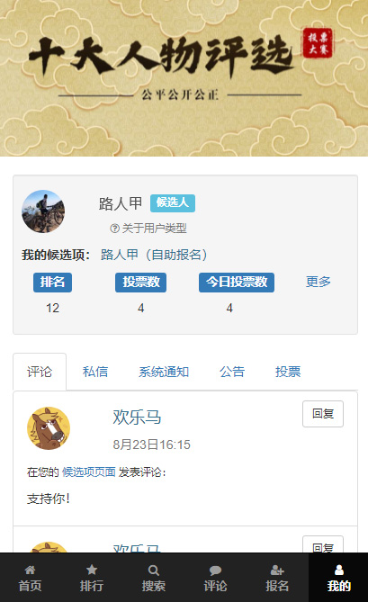 “用户”是指访问投票活动的所有人,按身份区分可分为普通用户、候选人、主办方三类,不同用户身份有不同的权限。例如,如果用户身份为候选人,用户就可以在用户中心栏目查看自己的最新票数情况和被投票记录等信息。