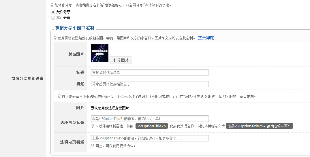分享内页的具体候选项时,因为内容是动态的,图片方面会自动调用选项的封面图片无需定义;而文字方面则可以使用模板语法用“<?OptionTitle?>”代表当前候选项的名称,再结合自定义的文字来实现,详见图4,最终在分享的时候模板代码就会自动替换为如图3红圈所示的当前分享候选项的标题。