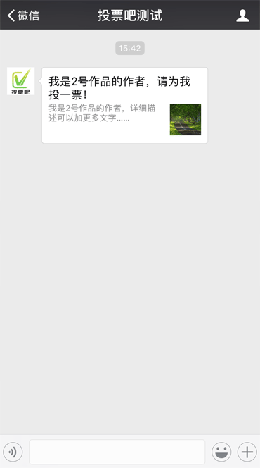 使用微信右上角工具栏,可以将投票页面分享给微信好友、微信群和微信朋友圈。微信传播投票页面时候会以一个图文小窗口的形式出现(如图1),窗口内的图片和文字都可以在投票吧后台进行设置。 按此可查看微信分享小窗口演示。
