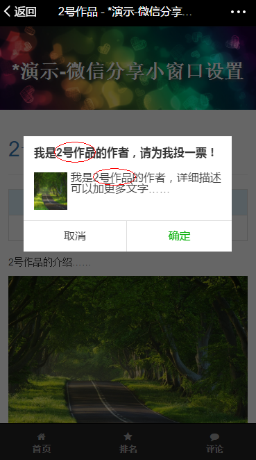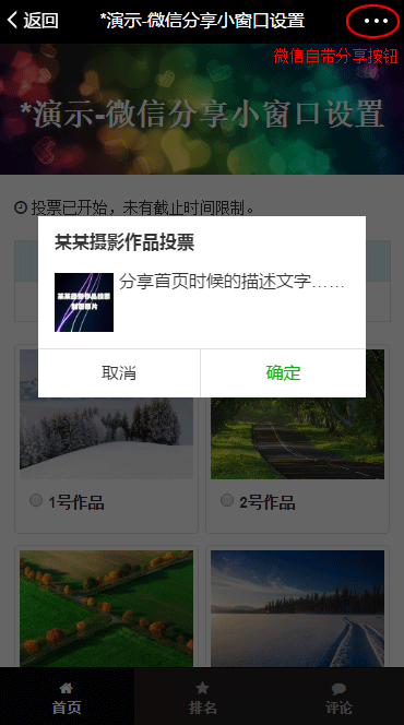 分享投票首页时,您可以定制小窗口内的图片、标题和详细描述文字。
