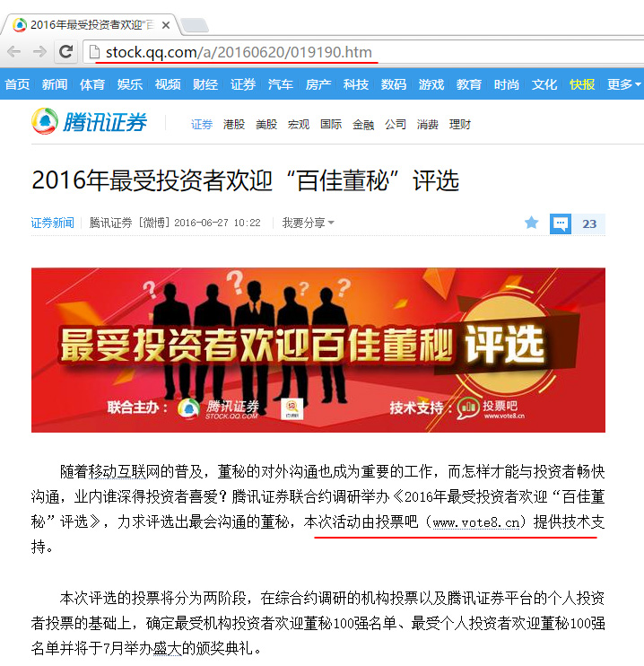 腾讯官网原文链接:http://stock.qq.com/a/20160620/019190.htm(百佳董秘), http://stock.qq.com/a/20160811/041931.htm(2016领军人物系列), http://stock.qq.com/a/20170307/006544.htm(315评选)