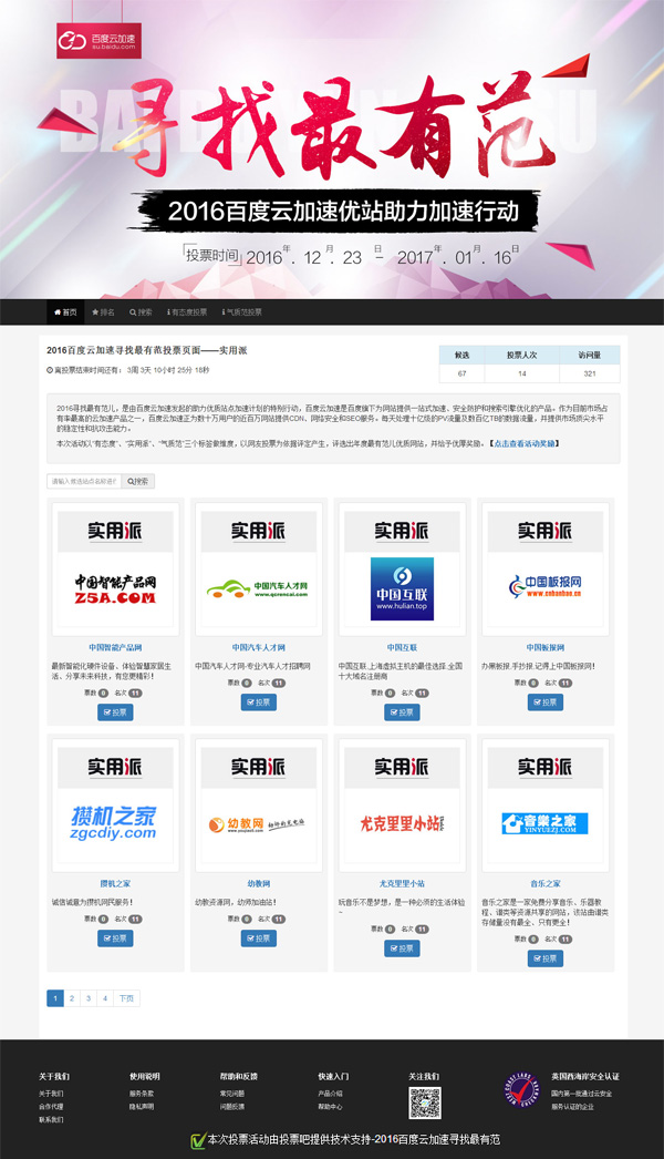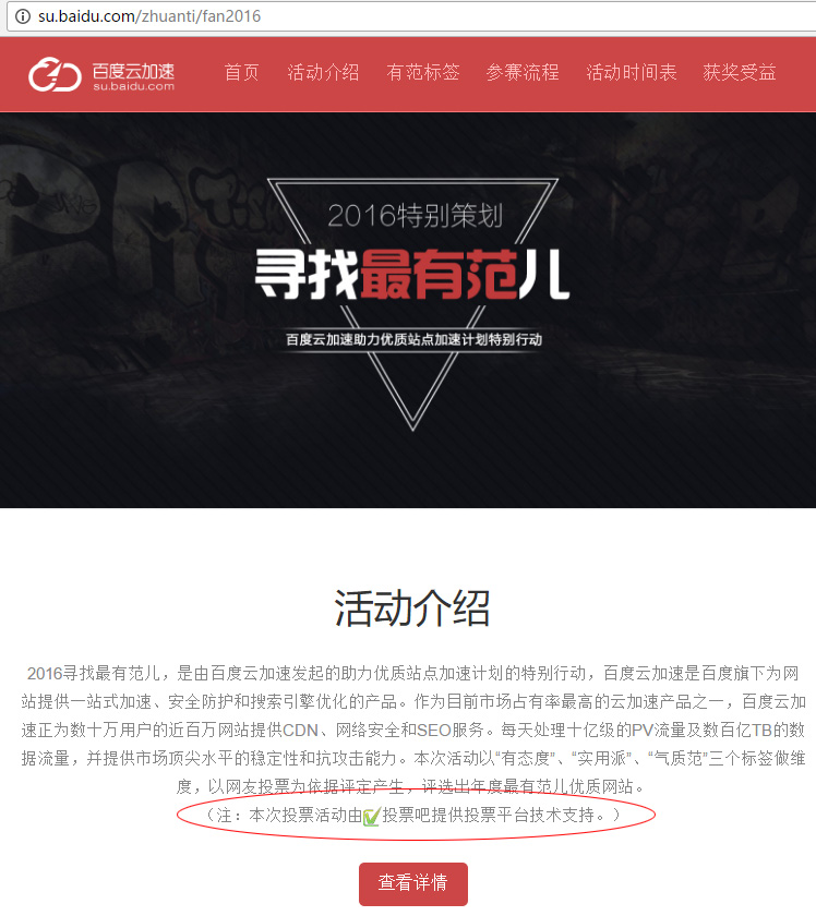 《2016寻找最有范儿优质网站》,是由百度旗下“百度云加速”发起的助力优质站点加速计划的特别行动,本次活动以“有态度”、“实用派”、“气质范”三个标签做维度,以网友投票为依据评定产生,评选出年度最有范儿优质网站。