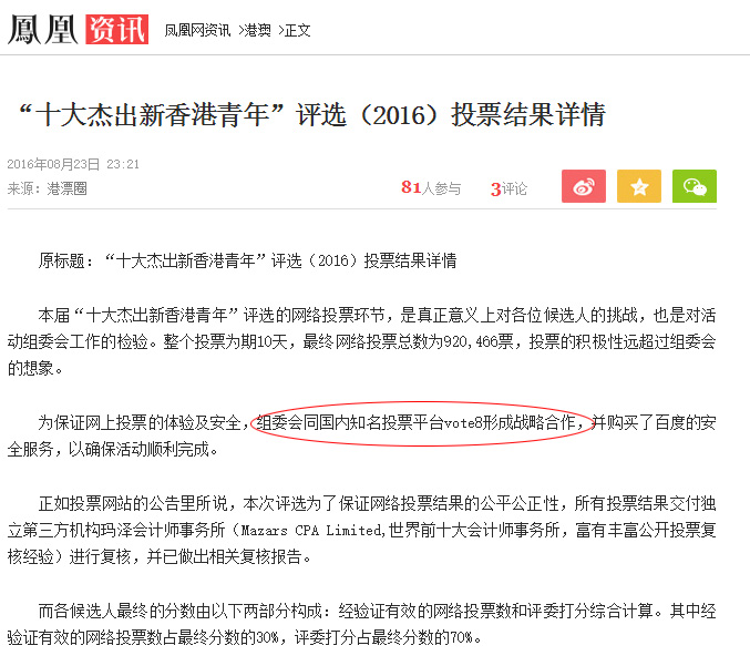 “投票吧”自2015年以来有幸连续两届成为该活动的网络投票平台独家提供商,为活动的网络票评选提供了有力稳定的技术保障。包括凤凰网在内的多家主流媒体均对本次活动及合作方投票吧进行了报道,原文链接。