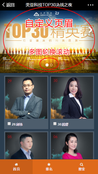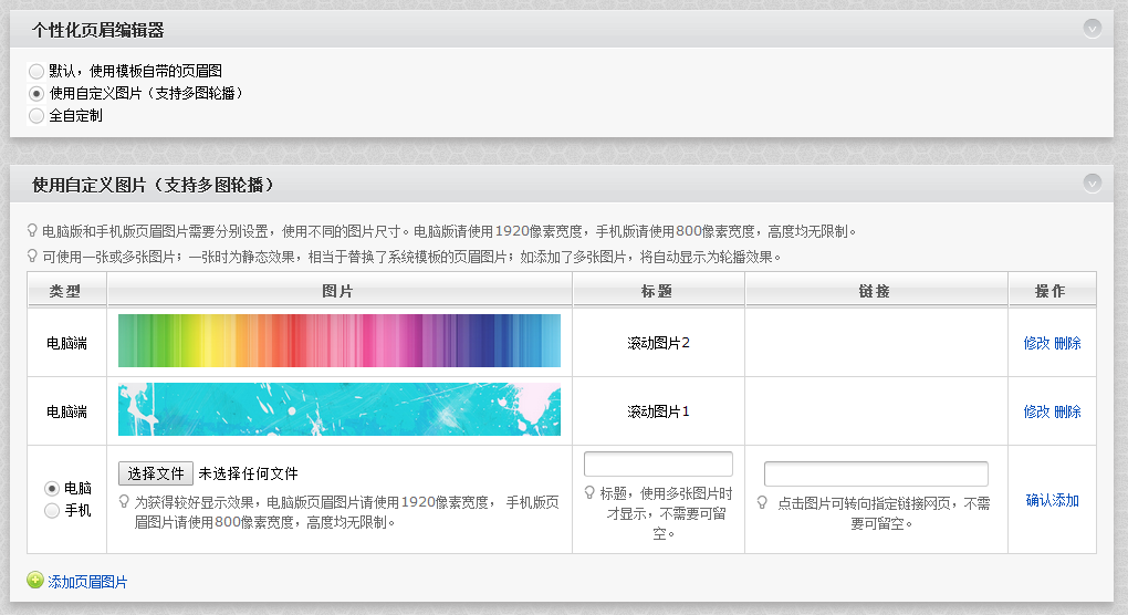 页眉页脚是指页面的最顶部和最底部,页眉很大程度决定了页面的整体设计风格,您可以通过后台直接上传自己设计的页眉图片,同时还能选择多图轮播功能。 对个性化有更高要求的用户,我们也提供了全自定义模式,图片、文字,甚至视频等设计元素。请在后台“个性-页眉(页脚)”下进行操作。