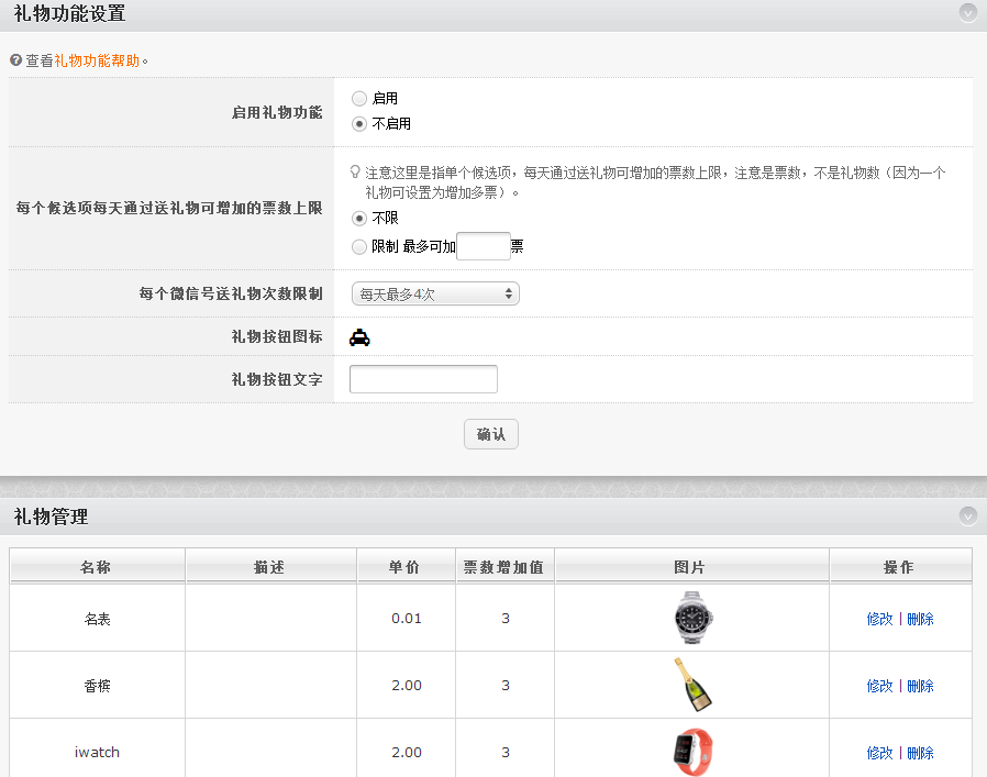 礼物的价格、每件礼物可抵票数、使用礼物加票的各种规则限制,均可在后台自主设置。