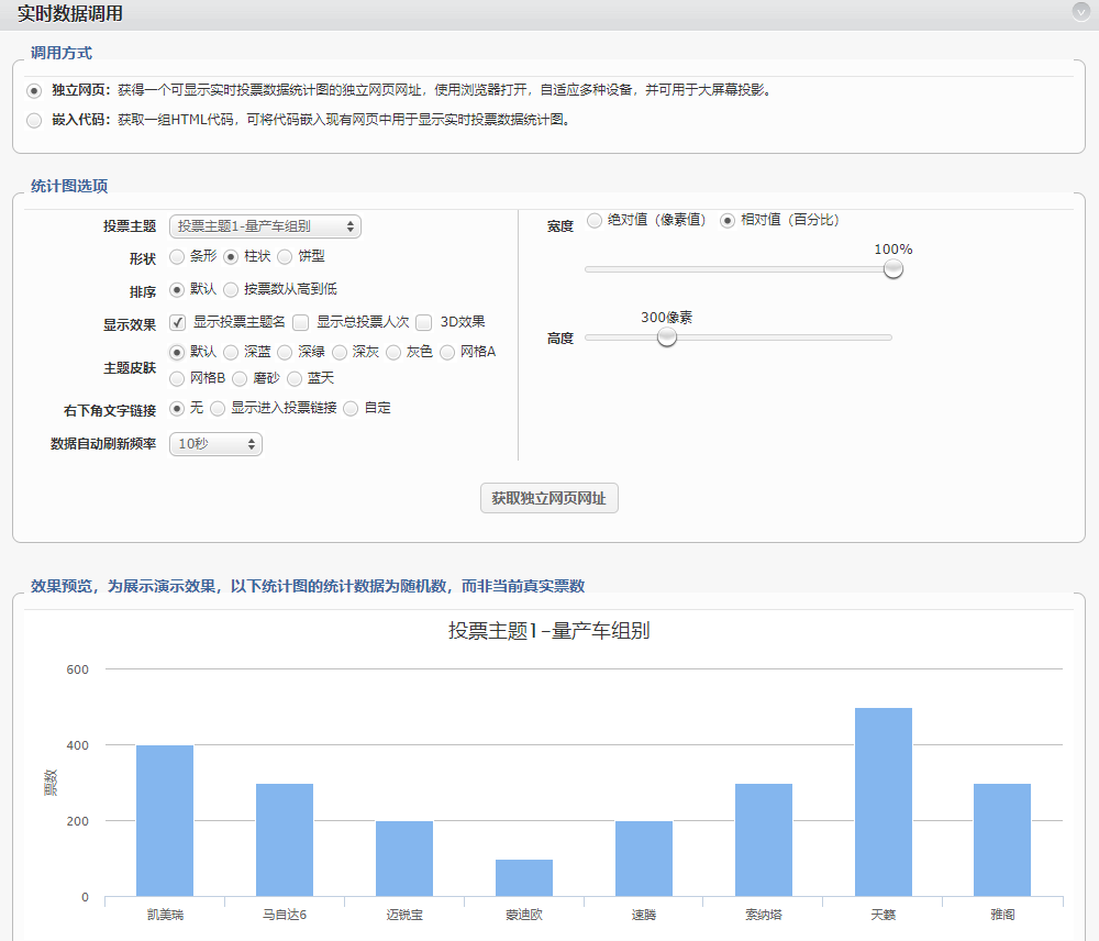 进入投票吧后台,访问“入口-实时数据调用”,即可获取一个用来显示实时投票结果的网址,请使用电脑、笔记本等设备的网页浏览器打开该网址,然后通过投影设备或通过视频线直连大屏幕,即可将电脑端的画面投射到大屏幕。实时数据页面可灵活设置统计图风格(饼型、柱状等)、颜色、刷新时间等。