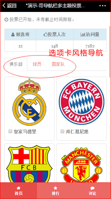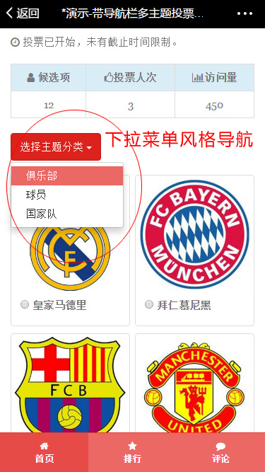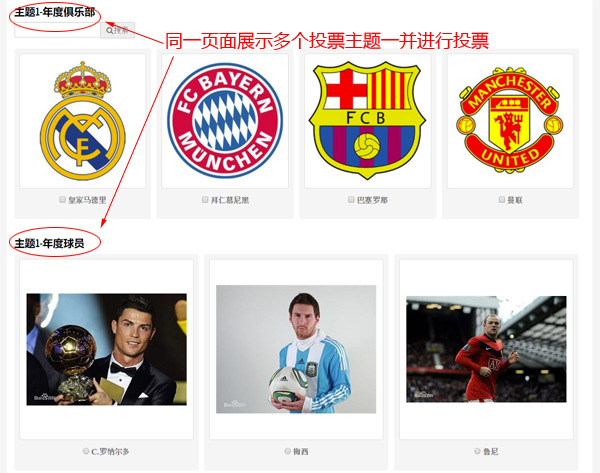 如以下示例某体育平台进行年度奖项评选,分为俱乐部、个人等多个奖项(主题),可以将这些主题放在同一个投票活动下,让投票者能一次完成选择和投票。