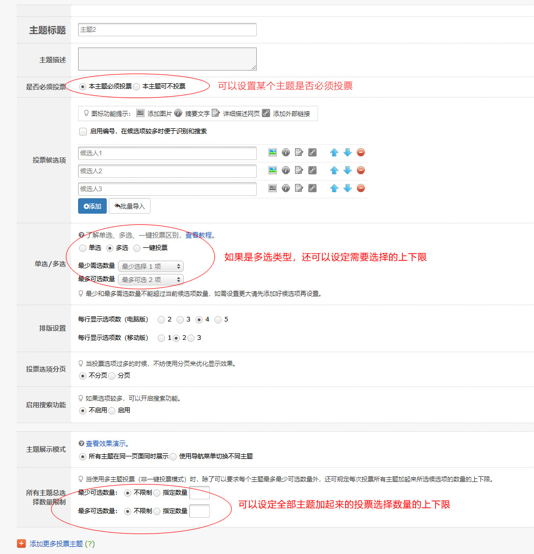 对于每个主题,可以单独设置是否必须投票;可以针对主题设置单选、多选或一键投票,多选情况下,可以设置最少最多可选候选项数量;针对所有主题加起来的所选候选项总数量,也可以设置上下限。上述功能可在后台“编辑-候选项管理”下设置。