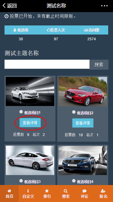 如果为候选项添加过详情页面,在首页点击候选项封面图(缩略图),会跳转到详情页,如果需要更明显的表达出可以点击显示详情,可以如下图开启按钮显示。有关如何添加详情页面,可参考