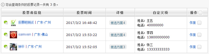 投票人信息请在后台“统计-投票明细日志”下查看,对于任何设置的投票活动,都能查看到IP、所在地区、投了哪个选项等信息。